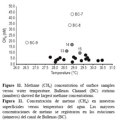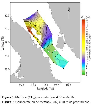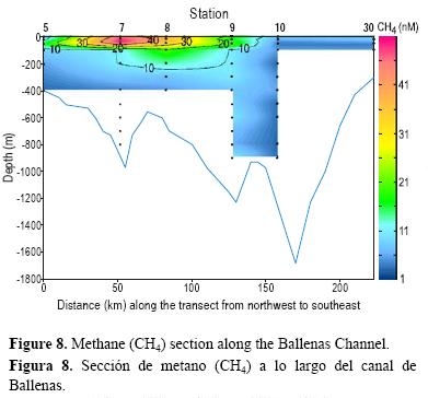 Los procesos que podrían ser responsables de las concentraciones de metano observadas en la región norte del GC incluyen la producción biológica en la columna de agua y sedimentos, la descomposición térmica de la materia orgánica sedimentaria y la producción abiogénica. No es posible distinguir claramente entre estas posibilidades con base en sólo las mediciones de la concentración de metano disponibles. Altas tasas de producción de metano junto con un reciclado biogeoquímico intensivo asociado con la alta productividad primaria estimulada por la entrada de agua rica en nutrientes a través de los umbrales en ambos extremos del CB (López et al. 2006) probablemente contribuyen a las generalmente elevadas concentraciones de metano en el CB. La posición del máximo y la forma de los gradientes de distribución de metano observadas en la figura 8, y con mayor claridad en la figura 9, sugieren una producción biológica de metano in situ en la columna de agua, probablemente en los intestinos de zooplancton (e.g., de Angelis y Lee 1994).