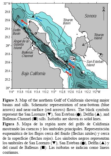 Mediciones directas de corrientes en los umbrales de San Esteban y San Lorenzo (ver fig. 3) han mostrado que el flujo hacia el norte cerca del fondo es de 0.18 Sv (1 Sv = 1x106 m3 s-1), dividido equitativamente entre los dos umbrales (López et al. 2006). El flujo a través del umbral de San Lorenzo (cerca de la estación 30) desciende hasta la parte más profunda del CB, causando un mezcla vigorosa conforme desciende de la profundidad del umbral (~400 m) a la parte más profunda de la cuenca (~1600 m). El flujo a través del umbral de San Esteban continúa por la cuenca Tiburón y eventualmente fluye sobre el umbral Delfín (ver fig. 3) y desciende en la cuenca Delfín, la segunda cuenca más profunda (~800 m) en la región norte del GC (López et al. 2008). La cuenca Delfín se conecta con el CB mediante el umbral del canal a una profundidad de 600 m (ver fig. 3). Por lo tanto, las dos cuencas más profundas en la región norte del GC reciben 0.18 Sv de agua, que es constantemente transportada a sus partes más profundas. Ambas cuencas están cerradas por debajo de los 400 m de profundidad y conectadas por la cuenca del CB. Por ende, el agua en este sistema de dos cuencas no puede fluir hacia afuera por debajo de los 200 m porque los flujos entrantes se extienden 100 a 200 m por arriba del fondo (400 m de profundidad en los umbrales de San Lorenzo y Delfín). Un cálculo de balances de materia simple tomando en cuenta el volumen de ambas cuencas, su área superficial y el flujo cerca del fondo de 0.18 Sv, arroja una velocidad vertical media de aproximadamente 5 m por día extendiéndose hacia arriba hasta por lo menos 300 m de la superficie del CB y la cuenca Delfín (López et al. 2008). Estas velocidades verticales son típicas de áreas de surgencia fuerte, pero en la región norte del GC son velocidades medias y no sólo velocidades máximas durante fuertes eventos de surgencia inducida por el viento. Este rápido transporte ascendente de agua rica en nutrientes es responsable de la alta productividad biológica en el norte del GC, especialmente en el CB que recibe ASS rica en nutrientes cerca del fondo en ambos extremos (López et al. 2006). Una salida de agua superficial debe contrarrestar la entrada neta de agua profunda y la surgencia asociada en el CB y la cuenca Delfín. Este flujo hacia afuera cerca de la superficie ha sido medido en el CB y en los umbrales de San Lorenzo y San Esteban (fig. 3). En el umbral de CB, el flujo cerca de la superficie se localiza entre 50 y 300 m de profundidad y es dirigida fuera del canal hacia el noroeste (López et al. 2006). En la figura 3 se presenta una representación esquemática de la circulación cerca del fondo y cerca de la superficie a través de los umbrales.