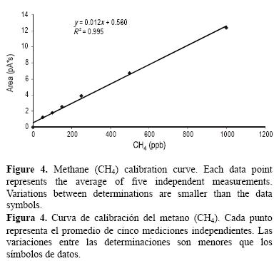 Se preparó una curva de calibración de siete puntos derivada de estándares de trabajo mediante la adición, con una jeringa hermética a los gases, de cantidades variables de un estándar de metano de 1000 ppb (Scott Marrin, Inc.) a volúmenes conocidos de He en bolsas para muestreo Kevlar. Todos los estándares fueron inyectados cinco veces, y los promedios de las áreas de los picos (en pA*s) fueron calculados y usados para la calibración. En la figura 4 se muestra una curva de calibración típica.