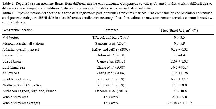 Se usaron la velocidad media del viento obtenida de Quickscat y el enfoque descrito anteriormente para calcular el flujo de metano del océano a la atmósfera para todas las estaciones. Todas las estaciones excepto 22 y 24 (que mostraron una ligera subsaturación) se encontraron sobresaturadas con respecto a la concentración en equilibrio con la atmósfera. Nuestros flujos de metano océano-atmósfera observados variaron de 3.4 a 103.4 μmol m-2 d-1 (tabla 1). Los mayores flujos de 103.4, 79.5, 39.3 y 37.5 μmol CH4 m-2 d-1 se observaron en las estaciones 7, 8, 9 y 14, respectivamente. Las estaciones 7, 8 y 9 se ubican en el CB, donde hay fuerte mezcla vertical y altas concentraciones de metano en el agua superficial (figs. 8, 11).