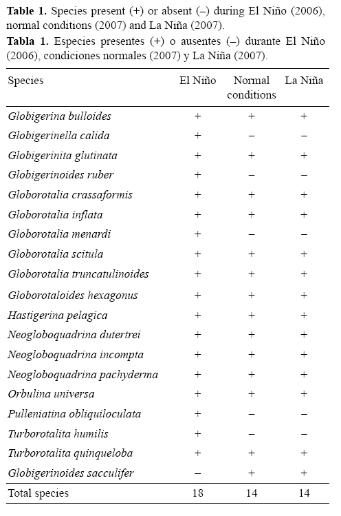 Key words: planktonic foraminifera, El Niño, La Niña, southeastern Pacific.