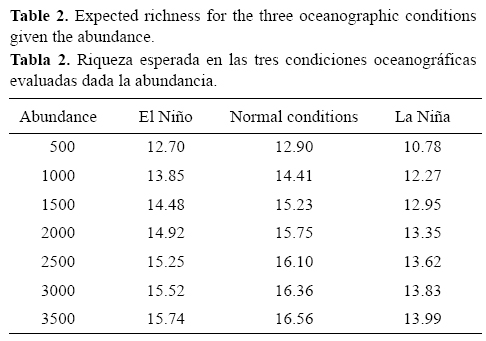 Las condiciones macroclimáticas ENSO pueden determinarse a nivel global, por lo que a nivel local fue necesario recurrir a las anomalías térmicas registradas en el área de estudio para establecer los eventos acontecidos durante el período de estudio. Se encontró una riqueza menor (18) durante la fase cálida estudiada (enero a diciembre de 2006) en comparación con las 19 especies documentadas frente a las costas de Coquimbo (30° S) durante EN de 1991-1992 (Marchant et al. 1998) y las 26 especies registradas durante EN de 1997-1998 (Coloma et al. 2005), lo que respondería directamente a la intensidad de cada evento. Por otro lado, el análisis de rarefacción, indicó un bajo número de muestras disponibles para encontrar una máxima riqueza durante CN y LN; pero, es importante mencionar que se muestreó todo el período durante CN, mientras que durante LN las muestras se recolectaron de julio a septiembre de 2007 y, según la NOAA, este evento se extendería hasta mayo de 2008. Este análisis predictivo sugiere que debería haber una mayor riqueza que la registrada en este estudio (14); sin embargo, durante las CN se documenta una riqueza menor (14) que las 17 especies registradas por Marchant et al. (1998) durante las CN de 1993 y 1994.