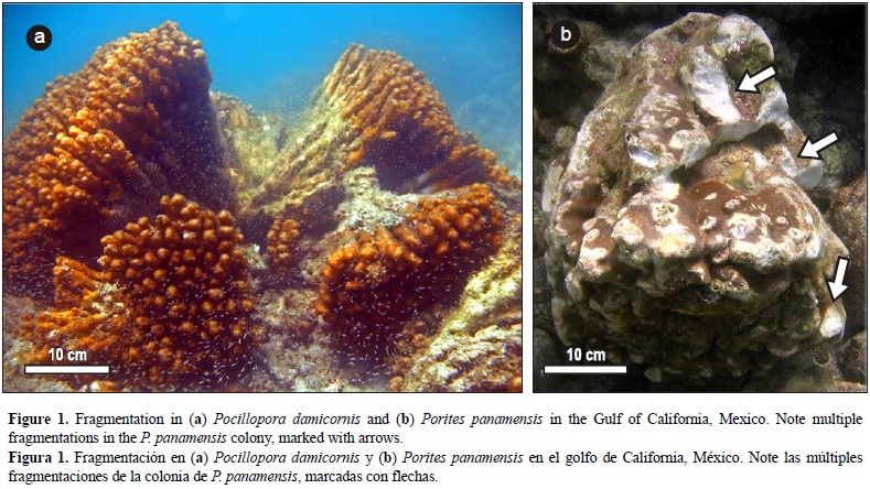 In the Gulf of California, detached fragments and whole P. panamensis colonies were observed (fig. 1). No significant association was found between the reproductive index values and frequency of hurricanes along the west coast of Mexico for P. panamensis colonies (table 2). Different processes may contribute to fragmentation in this species. For example, bioerosion by polychaetes, bivalves, and excavating sponges could make the coral skeleton more susceptible to fragmentation (Carriquiry and Reyes-Bonilla 1997, Reyes-Bonilla 2003), or differences in regeneration and partial mortality may cause fission of large colonies (Paz-García and Reyes-Bonilla 2006).