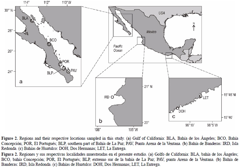 Collections were made in the most important regions of coral development off the west coast of mainland Mexico (Gulf of California, Bahía de Banderas, and Bahías de Huatulco; fig. 2). In the Gulf of California, samples of P. damicornis were collected at El Portugués (POR) and in the southern part of Bahía de La Paz (BLP); samples of P. panamensis were collected at Bahía de los Ángeles (BLA), Bahía Concepción (BCO), and BLP. Samples of both species were collected at Punta Arena de la Ventana (PAV), close to the entrance of the Gulf of California, and further south, at Isla Redonda (IRD) in Bahía de Banderas. In Bahías de Huatulco, P. damicornis was collected at Dos Hermanas (DOH) and La Entrega (LET); P. panamensis was collected only at LET. All coral samples were frozen in liquid nitrogen, transported to the laboratory, and stored at -80 °C.