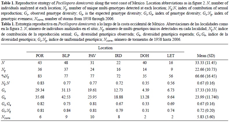 We sampled 139 colonies of P. panamensis; most of the colonies had unique genotypes (Ng = 127). The unique multi-genotypes ranged from 85% to 100% at each location (on average, 92.21 ± 6.4; fig. 3). The Ng:N average was 0.92 ± 0.06, ranging from 0.85 to 1.00 among locations (table 4). Observed and expected genotypic diversity (Go:Ge ratio) averaged 0.93 ± 0.07, ranging from 0.85 to 1.04. The Go:Ng ratio revealed that, on average, each genet is represented by an equal number of ramets (0.94 ± 0.04), ranging from 0.90 to 1.00 among locations (table 4); this result indicates high sexual reproduction, with Go:Ng values close to one (Coffroth and Lasker 1998). The percentage of unique genotypes and reproductive indexes showed that the massive coral P. panamensis mainly reproduced sexually along the west coast of Mexico, but also had low asexual reproduction at the southern locations. Recent studies of massive coral species show that fragmentation is higher than previously thought (Miller and Ayre 2008, Boulay et al. 2012). In this study, 24-30% of P. panamensis colonies at PAV, IRD, and LET originated by asexual reproduction. Similar percentages of asexual reproduction (8-25%) have been estimated for other four massive species: Porites lobata (Boulay et al. 2012), Montastraea annularis (Severance and Karl 2006), Montas-traea faveolata (Severance and Karl 2006), and Platygyra daedalea (Miller and Ayre 2008).