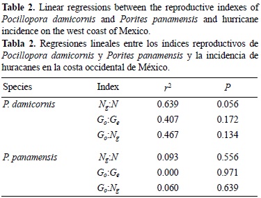 From 1958 through 2006, in the Gulf of California 44 hurricanes impacted the surrounding waters of these coral communities; 21 were category 1 and 2, 12 were category 3, and 11 were category 4 and 5 hurricanes. Contrary to expectations, no significant association was found between the P. damicornis reproductive index values and frequency of hurricanes along the west coast of Mexico (table 2). Few studies have explored the association of hurricanes and reproductive indexes in corals from genetic studies (Baums et al. 2006, Aranceta-Garza et al. 2012) or reproduction effects in disturbed habitats (Hunter 1993). Similar to the findings in this study, Baums et al. (2006) found higher clonal structure of the branching coral Acropora palmata in the Caribbean and no correlation with the incidence of hurricanes.