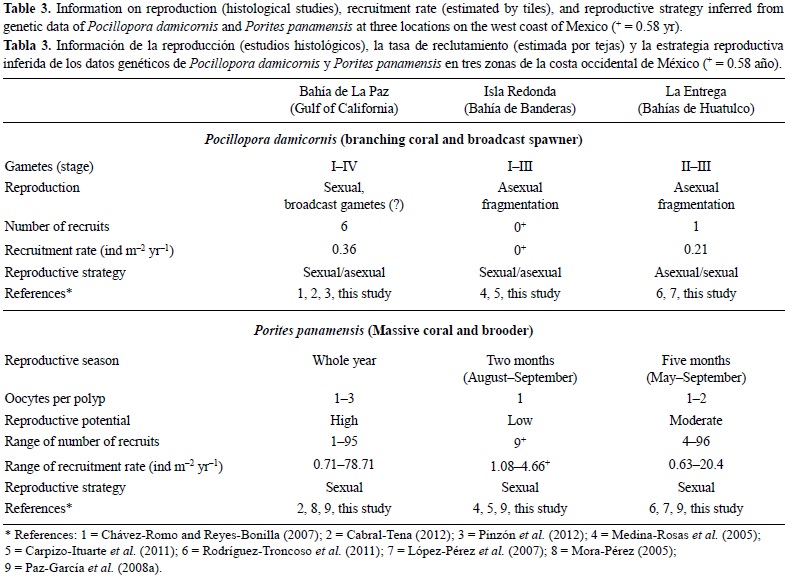 The highest number of colonies with unique genotypes (72-83%) and the highest reproductive indexes in this study were found in the Gulf of California and Bahía de Banderas, suggesting that sexual reproduction plays a major role in these areas. These results are also supported by previous studies, which indicate higher recruitment levels of Pocillopora sp. in the Gulf of California (0.36 ind m-2 yr-1, table 3), compared to the tropical part of the west coast of Mexico (López-Pérez et al. 2007, Cabral-Tena 2012; table 3). Moreover, it has been suggested that there was an exchange of propagules between coral communities after the 1997-1998 El Niño in the southern Gulf of California and Bahía de Banderas (Paz-García et al. 2012b). These findings indicate more favorable environmental conditions for sexual reproduction for P. damicornis and other coral species in the Gulf of California, which has an extended warm season and relatively more stable oceanographic conditions than Bahías de Huatulco (Chávez-Romo and Reyes-Bonilla 2007, Cabral-Tena 2012, Paz-García et al. 2012b). Thus, coral communities from the Gulf of California represent an important resource for generating genetic diversity by sexual reproduction and exporting propagules for the recovery of damaged coral communities.