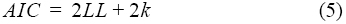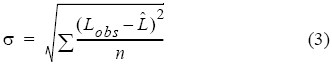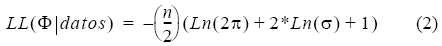donde LL es la máxima verosimilitud logarítmica negativa, Φ representa los parámetros de los modelos y σ representa la desviación estándar y fue calculada usando la siguiente ecuación: