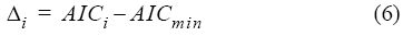 Para todos los modelos, se calcularon los valores de Δi como las diferencias entre los AICc de cada modelo (AICi) y el AICc con el menor valor (AICmin), según la siguiente ecuación: