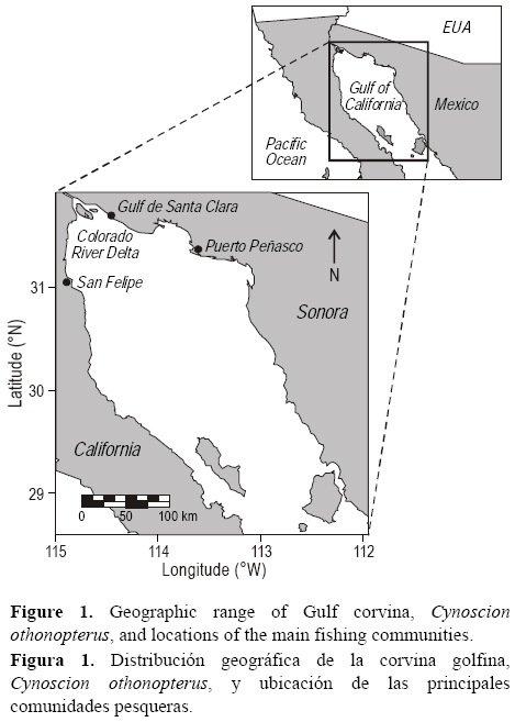 La corvina golfina, Cynoscion othonopterus (Jordan y Gilbert 1882), es endémica del Alto Golfo de California (AGC) (fig. 1). La familia Sciaenidae comprende a los peces comúnmente conocidos como, corvinas, curvinas, verrugatos y roncadores o roncachos (Chao 1995). La corvina golfina puede alcanzar una longitud total de 920 mm y vivir por lo menos 9 años (Román-Rodríguez 2000). Los adultos son carnívoros y se alimentan de crustáceos bentónicos como camarones y jaibas, moluscos como pulpos y calamares, y peces pelágicos formadores de cardúmenes como sardinas y anchovetas (Román-Rodríguez 2000). Esta especie presenta fidelidad al sitio y a la temporada de desove, y se considera dentro de las especies que forman agregaciones reproductivas (Sadovy y Erisman 2012). Las agregaciones reproductivas de los adultos de corvina golfina se presentan en la boca del delta del río Colorado (DRC) de febrero a mayo de cada año (Román-Rodríguez 2000, Erisman et al. 2012, Sadovy y Erisman 2012). Cynoscion othonopterus es una especie gonocórica (sexos separados), ovípara (los huevos se desarrollan fuera del cuerpo del organismo) e iterópara (produce crías en sucesivos períodos anuales y estacionales).
