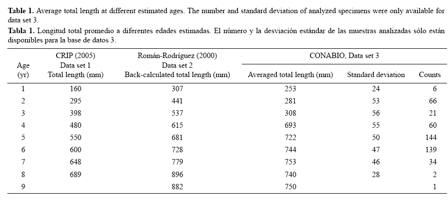 Los datos se obtuvieron de la base de datos de CONABIO (SNIB-CONABIO; http://www.conabio.gob.mx/institucion/cgi-bin/datos.cgi?Letras=L&Numero=298), específicamente de la hoja de cálculo Datos ecológicos 4 (Román-Rodríguez 2000). Para información más detallada sobre el período de muestreo, la cantidad de peces muestreados por mes, el número de años y el sexo, se recomienda visitar la hoja de cálculo en la página de internet mencionada líneas arriba. En resumen, los datos son la longitud a la edad de corvina golfina del AGC. La edad se calculó contando las bandas de crecimiento anual observadas en la sección transversal de los otolitos (para más detalles también se puede consultar Gherard et al. 2013). Se midieron un total 473 ejemplares (243 machos, 211 hembras y 19 juveniles indiferenciados). Para obtener los parámetros de crecimiento se utilizó la longitud total de cada organismo a la edad determinada, así como el promedio de los datos. Los datos utilizados son los datos combinados de las capturas de la pesquería dirigida y de las capturas incidentales de otras pesquerías. La pesca dirigida captura organismos más grandes, incluyendo organismos que pueden ser más grandes que la longitud promedio a la edad. La pesca incidental captura peces de menor tamaño y posiblemente más pequeños que la longitud promedio a la edad (Gherard et al. 2013). También se usaron los datos promedio de la longitud a la edad publicados por CRIP (2005) y los datos de Román-Rodríguez (2000) presentados como retrocalculados (tabla 1) y que provienen de la misma base de datos entregados a CONABIO. De aquí en adelante, los datos analizados se denominan base de datos 1 (CRIP 2005), base de datos 2 (Román Rodríguez 2000), base de datos 3 (datos promedio de CONABIO) y base de datos 4 (datos totales de CONABIO). Para validar las determinaciones de edad, Román Rodríguez (2000) utilizó las relaciones entre edad y peso de los otolitos, edad y radio de los otolitos, así como longitud y radio de los otolitos (para más detalles véase también Gherard et al. 2013).