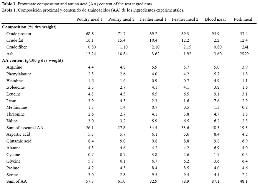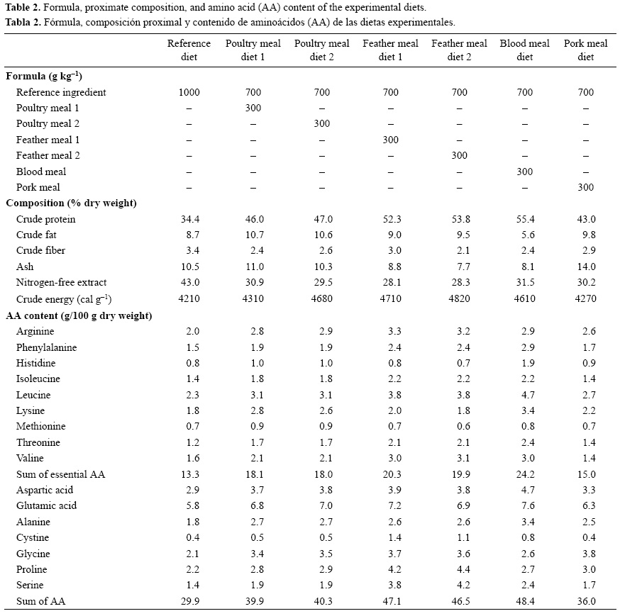 La composición proximal de los ingredientes fluctuó (tabla 1): el contenido de proteína osciló entre 57.4% (harina de cerdo) y 95.9% (harina de sangre), el contenido de lípidos entre 2.2% (harina de sangre) y 16.1% (harina avícola 1), el contenido de ceniza entre 1.92% (harina de pluma 2) y 25.29% (harina de cerdo) y el contenido de fibra entre 0.8% (harina avícola 1 y harina de sangre) y 2.41% (harina de cerdo). El mayor contenido de aminoácidos por cada 100 gramos de base seca lo presentó la harina de sangre (87.1 g), seguida de la harina de pluma 1 (82.9 g), la harina de pluma 2 (78.9 g), la harina avícola 2 (61.0 g), la harina avícola 1 (57.7 g) y la harina de cerdo (48.1 g) (tabla 1). La concentración total de aminoácidos analizados en las dietas experimentales fluctuó entre 29.9 (dieta de referencia) y 48.4 g/100 g de base seca (dieta con harina de sangre) (tabla 2).