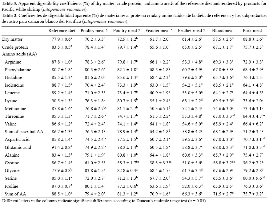 Los CDA de materia seca, proteína cruda y aminoácidos para los seis ingredientes evaluados fueron inferiores comparados con la dieta de referencia, lo cual hace evidente que estos ingredientes son menos digestibles que una dieta tipo comercial. Los CDA de aminoácidos (estándar) para los subproductos de rastro fueron sobreestimados por la pérdida de nutrientes en el agua. Los dos tipos de harina avícola fueron los ingredientes más digestibles (corregidos por lixiviación), seguidos de la harina de cerdo, los dos tipos de harina de pluma y la harina de sangre. La harina de pluma es una de las mejores fuentes de valina digestible y la harina de sangre es la mejor fuente de histidina digestible para L. vannamei.