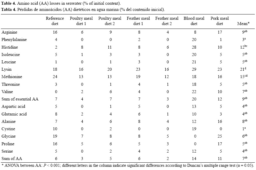 Se utilizaron los valores de lixiviación de las dietas después de una hora de inmersión en agua marina. Para tomar en cuenta las pérdidas de materia seca, proteína y aminoácidos de las dietas antes de ser ingeridas por el animal, se corrigió la digestibilidad aparente de proteína cruda, materia seca y aminoácidos empleando las ecuaciones registradas por Cruz et al. (2009).