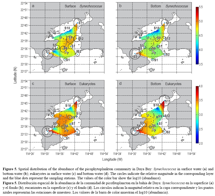 The abundance of picoeukaryotes was lower than that of Synechococcus in the bay. The abundance of picoeukaryotes ranged from 0.78 x 103 to 7.95 x 103 cell mL-1 (fig. 5c, d). The spatial distribution of picoeukaryote abundance was similar to that of Synechococcus.
