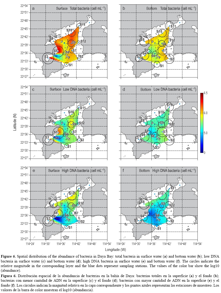 In addition, the similar spatial pattern between the LDNA and HDNA groups may indicate that they may be better adapted to productive coastal waters, hence suggesting a niche partitioning between the similar bacterial groups. However, bacterial abundance in the eastern, northern, and western parts of the bay is slightly higher than in the rest of the areas (fig. 8). Our results suggest that the HDNA and LDNA groups may possess their own environmental niche with favorable conditions for them. The spatial differences in variability in bacterial abundance (HDNA and LDNA) may be due to system-specific changes in environmental parameters.