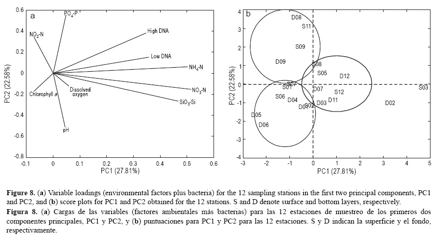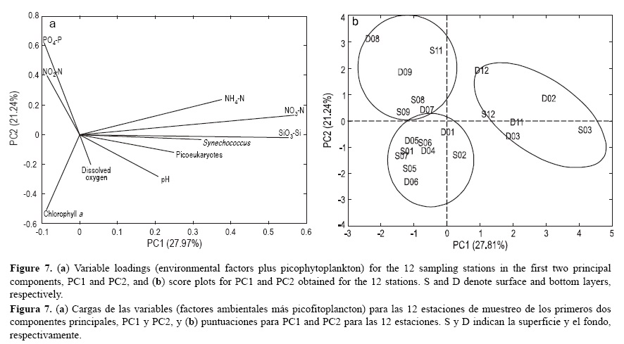 The PCA for picophytoplancton vs environmental factors and bacteria vs environmental factors was used to identify key environmental variables that could explain the picophytoplankton (Synechococcus and picoeukaryotes) and bacterial (HDNA and LDNA) abundances, respectively. For picophy-toplankton, PC1, which explained 49.21% of the variation of the environmental data, was highly correlated with Synechococcus and nutrients (fig. 7a). PC2 explained 21.24% of the variation and was highly correlated with PO4-P and NO2-N. Both Synechococcus and picoeukaryotes were positively related to PC1 and negatively related to PC2. From the score plot, the spatial distribution of the samples can be observed clearly (fig. 7b). Three stations (S3, S11, and S12) were located in the western and eastern parts of the bay. The scores of these stations were positive in PC1. The two stations (S8 and S9) located around the central and northwest parts of the bay clustered. The scores of the rest of the stations (S1, S2, and S4-S7) located around the mouth and in the central part of the bay were negative and positive in PC2.