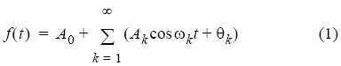 where the sinusoidal component at the angular frequency, ωk = kω0, is the kth harmonic of the function f(t) and t is the time. The first harmonic of the series is the fundamental component of f(t), with an angular frequency of ω0 = 2πf0 = 2π/T (rad s1), where T is the fundamental period and f0 is the fundamental frequency (in Hz). Coefficients Ak and θk are the kth harmonic amplitude and kth phase angle, respectively, with A0 as a constant.