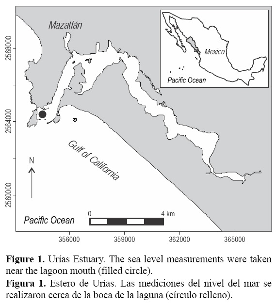 The sea level was measured with a HOBO Titanium Water Level Data Logger (U20-001-01-Ti), located near the lagoon mouth (23º10'53.15'' N, 106º25'25.93'' W; fig. 1). This and other autonomous probes have been deployed in the lagoon in order to provide long-term time series. Water column pressure data were collected every 30 min during a period of 326 days. This sampling period was considered to be adequate to capture diurnal sea level cycles and, at the same time, it allowed extending both the probe internal battery life and memory. The certified instrument uncertainty was ±0.05%. In order to calculate the sea level, the atmospheric pressure was subtracted. Finally, the tidal elevation was referred to mean sea level.