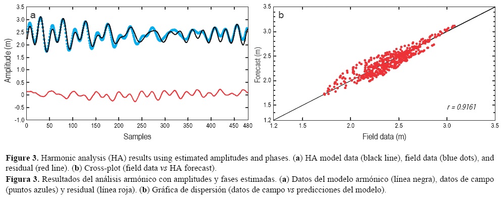 As a general observation, HA uses the average frequency and amplitudes of the series during the period of study and no previous knowledge (initial conditions) is required. The model is stable for long time periods and if enough harmonics are identified and used in the model, it is suitable for predicting values on long time scales. Nevertheless, HA cannot model local distortions, such as those originated by meteorological forcing. The water circulation in Urías Estuary is mostly driven by the Gulf of California tides, which are mainly co-oscillations of the Pacific Ocean tides (Carbajal and Backhaus 1998). Its tidal regimen is mixed semidiurnal (Hendershott and Speranza 1971, Filloux 1973), with M2, S2, K1, O1, N2, K2, and P1 tidal harmonics (Carbajal 1993). In this work, we also found Q1.