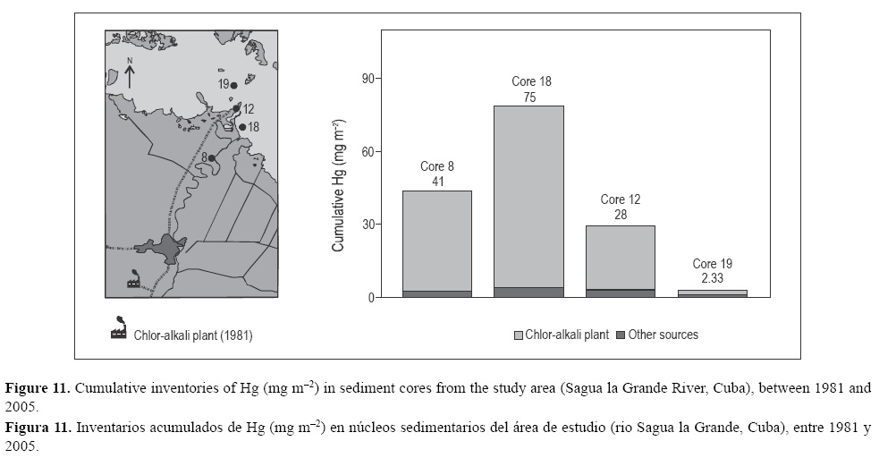 De forma general, la radiocronología de los sedimentos con 210Pb y otros radiotrazadores ambientales permitió evaluar los cambios en el régimen sedimentario en el estuario del río Sagua la Grande, así como la contaminación por Hg durante las últimas cuatro décadas. Estos resultados constituyen un registro temporal de la magnitud del impacto de la planta de cloro-sosa sobre el estuario y su zona costera aledaña. En todos los casos, los sedimentos con alta contaminación por Hg se encontraron en las capas superficiales (primeros 20 cm). La ocurrencia de eventos naturales y/o la ejecución de actividades antropogénicas en la zona pueden removilizar los sedimentos contaminados y causar impactos sobre los ecosistemas costeros y la salud humana a través del consumo de productos marinos.