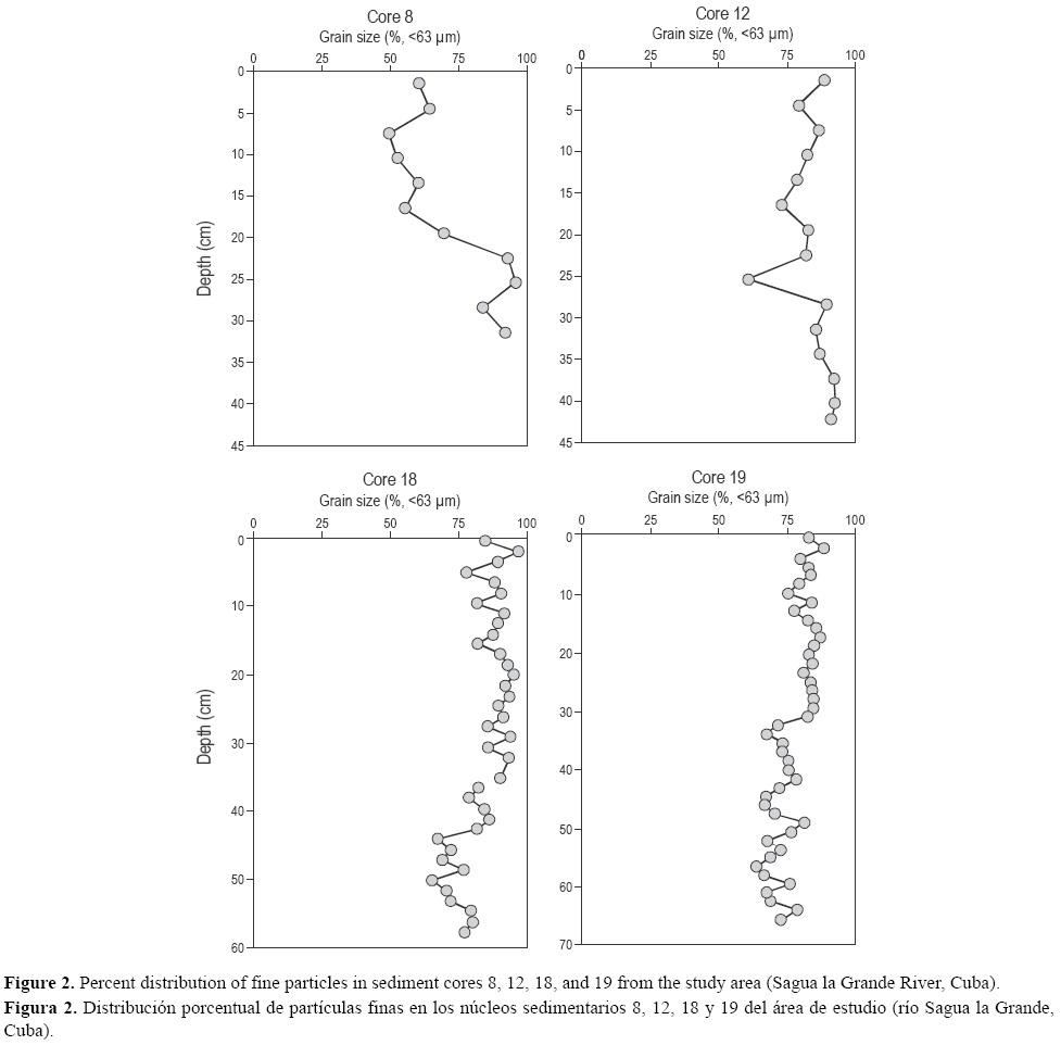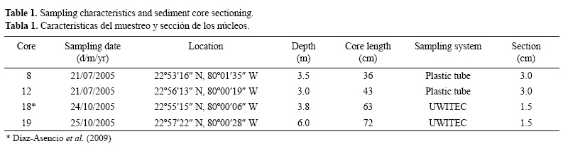Se recolectaron cuatro núcleos sedimentarios de diferentes longitudes y en diferentes zonas próximas a la desembocadura del río Sagua la Grande (tabla 1). Se recolectaron dos núcleos sedimentarios en el estuario del río (estaciones 8 y 12, fig. 1) mediante un tubo de plástico (60 cm de longitud y 10 cm de diámetro), y otros dos núcleos en la zona costera (estaciones 18 y 19, fig. 1) mediante un nucleador de gravedad (11 cm de diámetro). Los resultados del núcleo 18 fueron parcialmente publicados anteriormente (Díaz-Asencio et al. 2009). En todos los casos, el muestreo se realizó mediante buceo autónomo para evitar la compactación y mezcla de los sedimentos.