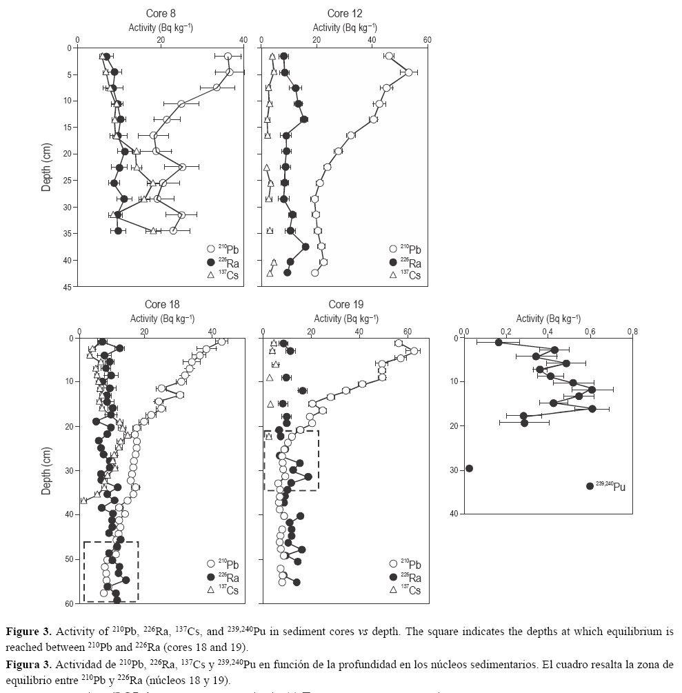 En los cuatro casos, la actividad de 210Pb fue máxima en la superficie y disminuyó con la profundidad. En los núcleos 8 y 12, no se alcanzó el equilibrio entre 210Pb y 226Ra, lo cual indica fechas de sedimentación menores que 100 años. En los núcleos 18 y 19, el equilibrio se alcanzó a los 50 y 27 cm de profundidad, respectivamente.