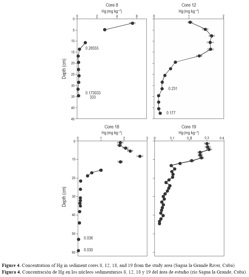 Se observaron diferencias en la concentración de Hg en relación con la profundidad entre los núcleos sedimentarios (fig. 4). El valor máximo (5.57 mg kg-1) se observó en la superficie del núcleo 8, independientemente del incremento relativo en la granulometría en este segmento. Los núcleos 12 y 18 mostraron concentraciones máximas sub-superficiales de 1.65 y 2.68 mg kg-1, respectivamente. El núcleo 19 presentó un valor máximo de 0.31 mg kg-1 en la superficie.