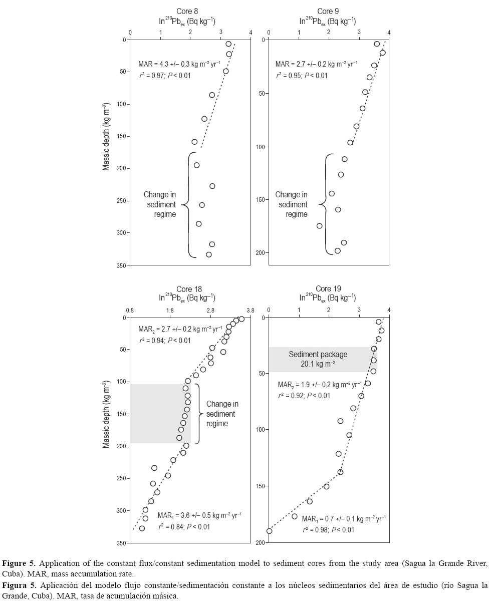 Las TAM promedio (fig. 5) se calcularon con base en el modelo de flujo constante/sedimentación constante (CFCS, por sus siglas en inglés; Crozaz et al. 1964, Koide et al. 1973, Sanchez-Cabeza y Ruiz-Fernández 2012). El cambio observado en algunos perfiles de ln 210Pbex (210Pb en exceso) indicó un cambio en el proceso de sedimentación, y, por consiguiente, los núcleos se analizaron por segmentos.