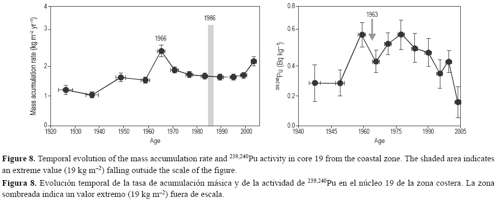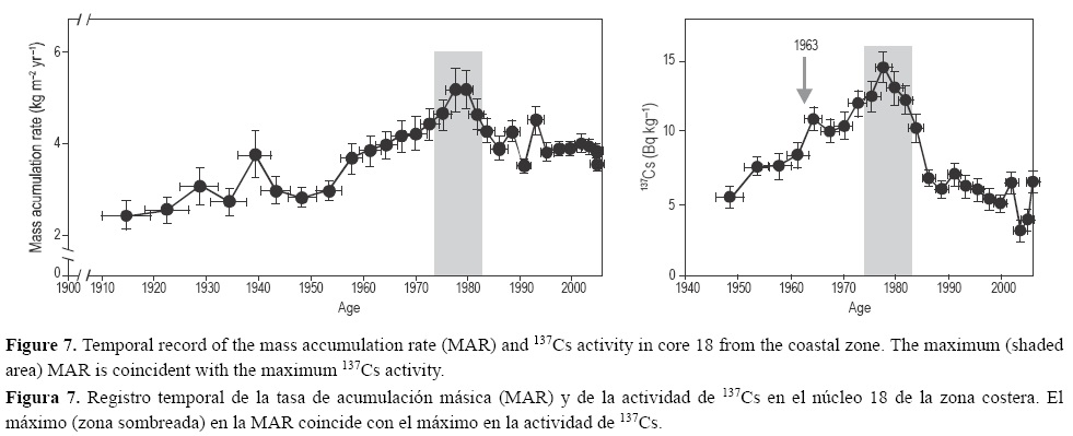 En el núcleo 18, la TAM mostró un primer valor máximo en 1939 y, luego, un lento incremento lento hasta 1950 (fig. 7). Después de 1960, se observó un incremento significativo de la acumulación hasta alcanzar un valor máximo en 1980, seguido de una tendencia a la disminución hasta alcanzar un valor relativamente estable durante los últimos 10 años (cercano a los 3.5 kg m-2 año-1). Si bien la detección de 137Cs se corresponde bien con el inicio de la precipitación radiactiva global en 1953 (Robbins et al. 2000), el máximo en 1963 es inferior al observado a finales de la década de 1970 (zona sombreada en fig. 7), probablemente debido a la erosión y arrastre durante estos años de suelos con valores más elevados de 137Cs. Alonso-Hernández et al. (2006) registraron un comportamiento similar para la bahía de Cienfuegos.