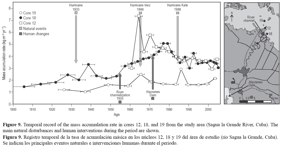 A partir de la cronología por 210Pb y las TAM, se reconstruyeron los procesos de sedimentación en el tramo final del río Sagua la Grande y la zona costera aledaña durante los últimos 100 años (fig. 9). Para el análisis, se tomaron en cuenta los eventos naturales y antropogénicos más importantes ocurridos en la región. Las inundaciones y huracanes generalmente provocan incrementos en las tasas de acumulación y cambios en la composición de los sedimentos acumulados (Carroll et al. 1999, Ruiz Fernández et al. 2002). Por otra parte, la ejecución de obras hidráulicas puede modificar la hidrodinámica de un río y afectar directamente el régimen de sedimentación (Godoy et al. 1998, Mussi et al. 2007).