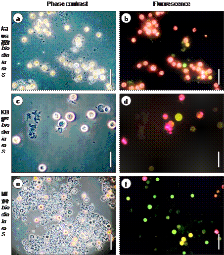 Figura 2 Transformación mediada por perlas de vidrio y PEG con el plásmido pCB302-gfp-AtRACK1C en Symbiodinium spp. Las células de Symbiodinium kawagutii (a, b), Symbiodinium KB8 (c, d) y Symbiodinium Mf11 (e, f) fueron transformadas usando perlas de vidrio, PEG y el plásmido pCB302-gfp-AtRACK1C. Las células fueron observadas bajo microscopía de contraste de fases (a, c, e) y epifluorescencia (b, d, f) después de 8 (a, b), 25 (c, d) ó 26 (e, f) días de selección con Basta. Las barras equivalen a 30 µm (a, b), 20 µm (c, d) y 25 µm (e, f).