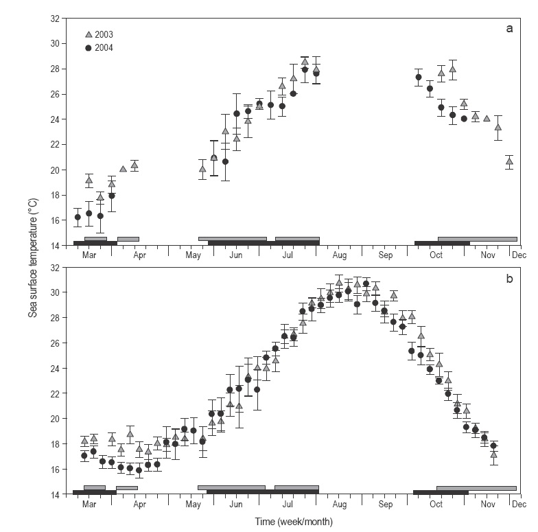 Mean SST ± SD in 2003 (25.2 ± 3.3 °C), measured in situ, was significantly higher than in 2004 (23 ± 4.1 °C; t548 = 6.44, P< 0.001). Seasonal temperature variations were high since the difference between March and October was 2 °C, compared with an interannual difference of 1.5 °C (Fig. 2a).