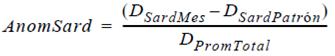 donde DSardMes es el desembarque (toneladas) de sardina mensual del dato original, DSardPatrón es el promedio del patrón de desembarque (toneladas) de sardina en el periodo 1961-2005 y DPromTotal es el desembarque (toneladas) de sardina promedio total mensual. Se relacionaron linealmente las series de tiempo físicas con las biológicas (anomalías de los desembarques de sardina) considerando una regresión polinomial (mejor ajuste obtenido con ordenación de 6):