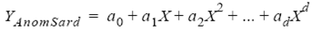 donde YAnomSard es la anomalía de desembarque de sardina (adimensional), X corresponde a los años (1961-2005) y a0... ad son los coeficientes de la ecuación.
