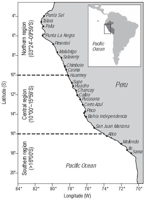 El área de estudio abarcó todo el litoral peruano, desde puerto Pizarro (03°30'S, 80°24'W) en la frontera norte hasta La Concordia (18°20.8'S, 70°22.6'W) en la frontera sur, y desde la línea de la costa hasta las 200 millas náuticas (mn). Para el análisis se consideraron tres regiones: norte, centro y sur (Fig. 1).