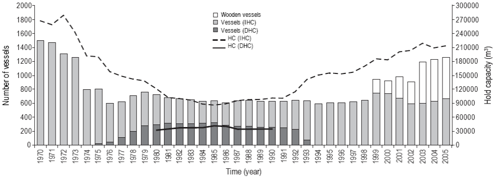 Figura 2: Número de embarcaciones de cerco (de acero y de madera ["vikingas"]) y capacidad de bodega (HC) de la flota industrial peruana dirigida a la pesca de sardina y anchoveta para consumo humano indirecto (IHC) y consumo humano directo (DHC) durante el periodo comprendido entre 1970 y 2008.
