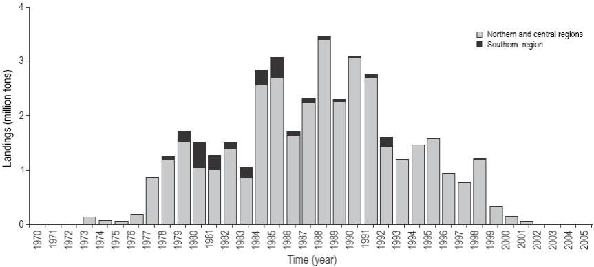 En la década de 1980, se registraron los mayores volúmenes de desembarque de sardina (excepto durante El Niño 1982-1983), incluyendo la cifra máxima de 3.5 millones de toneladas en 1988. A partir de 1990, las capturas decrecieron a niveles promedio anuales cercanos a 1 millón de toneladas en el periodo 1992-1998, y luego a 132 t.