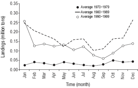 Para las décadas de 1980 y 1990, se observó una estacionalidad en los desembarques de sardina, con los mayores rendimientos en el verano y la primavera austral (Fig. 4).