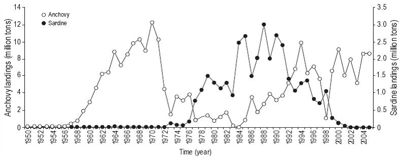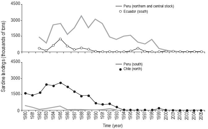 Durante las últimas tres décadas existió una alternancia espacial y temporal entre la abundancia de las poblaciones pesqueras de sardina y anchoveta. En la década de 1980, la sardina ocupó extensas áreas de pesca y el incremento de la biomasa poblacional se reflejó en las mayores capturas; este periodo se considera como la "década sardinera". Santander (1981) atribuyó la dominancia de sardina a una mayor extensión de las áreas de desove, un incremento en el número de huevos y una expansión del área de distribución. Lo contrario sucedió durante la década de 1990, cuando predominó la anchoveta. En el período 2000-2005 la sardina desapareció de las áreas tradicionales de pesca.