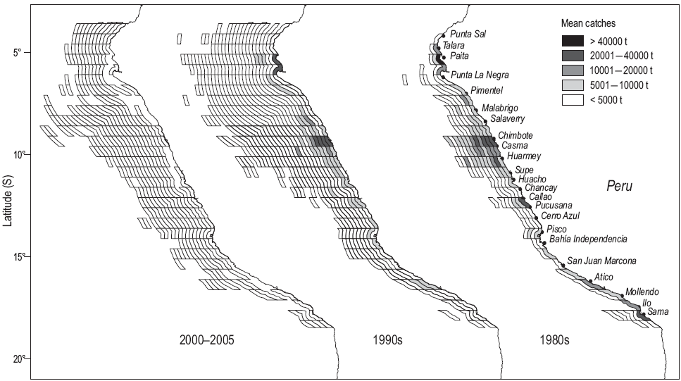 En el período 1999-2005, cuando las capturas de sardina decrecieron abruptamente, el esfuerzo se dirigió casi exclusivamente a la anchoveta.