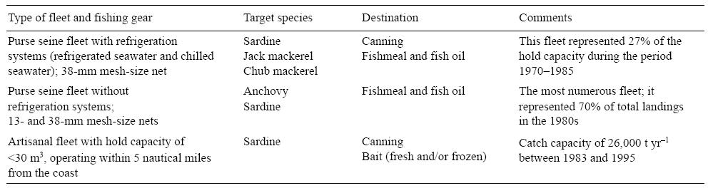 Flota artesanal conformada por embarcaciones cuya capacidad de bodega fue menor que 30 m3 y que operaron dentro de las 5 mn de la costa. En el periodo entre 1983 y 1995, la producción fue de 26,000 t de sardina por año y fue utilizada en la conservería (CHD) y como carnada.
