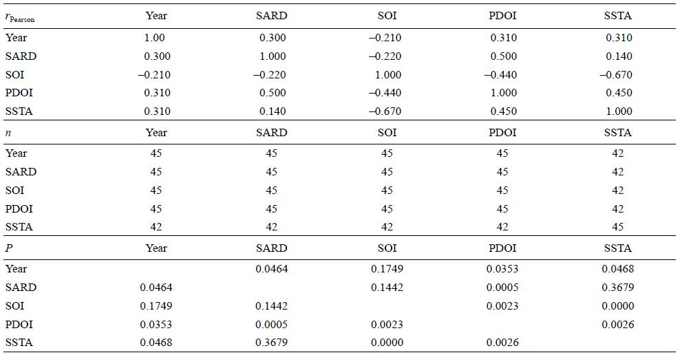 Tabla 2: Correlación de las anomalías de los desembarques de sardina (SARD) vs los índices ambientales (SOI, Índice de la Oscilación del Sur; PDOI, Índice de la Oscilación Decadal del Pacífico; SSTA, Anomalías de la Temperatura Superficial del Mar) con base en el coeficiente de correlación de Pearson. Serie histórica:1961-2005.