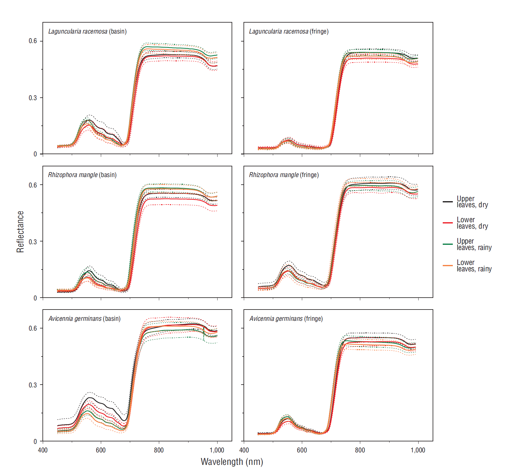 Figure 2 Average reflectance (n = 30, solid line) and first standard deviation (dashed line) for leaves of 3 mangrove species in basin and fringe forests.