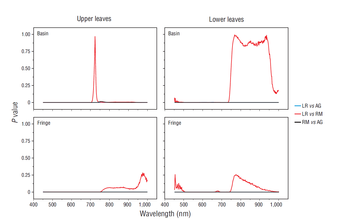Figure 3 Probability (P) plots of leaf spectral data for Laguncularia racemosa (LR), Rhizophora mangle (RM), and Avicennia germinans (AG) during the dry season.