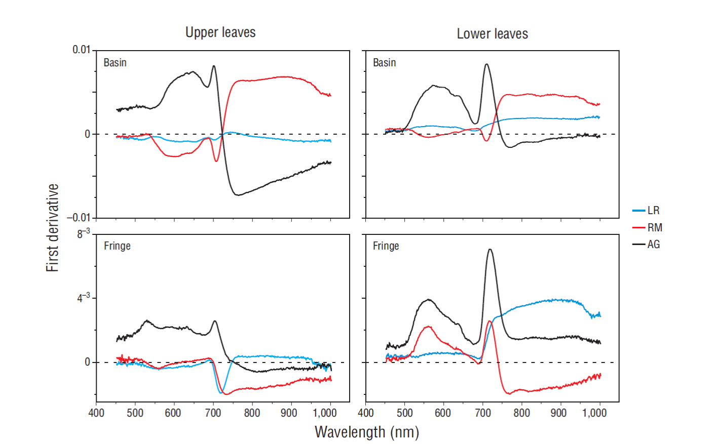 Figure 5 First-derivative plots of leaf spectral data for Laguncularia racemosa (LR), Rhizophora mangle (RM), and Avicennia germinans (AG) during the dry season.