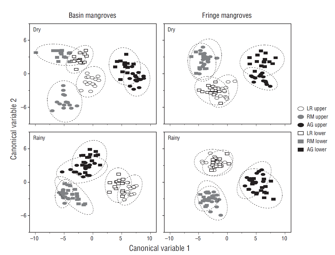 The CDA showed successful discrimination between mangrove species when the green and red-edge wavelengths were used (Fig. 7). Species in the basin mangrove forest showed notable separation between samples from upper and lower parts of the forest canopy during the dry season. During the rainy season, the 3 mangrove species could be separated, but no significant differences were found between both parts of the canopy. This last pattern was observed for the fringe mangrove samples during both seasons. It was not possible to separate species and physiognomic types using the wavelengths suggested by Wang and Sousa (2009) for the same 3 mangrove species (Fig. 8). Only the combination of wavelengths suggested by Zhang et al. (2014) can discriminate basin and fringe mangrove species during the rainy season (Fig. 9). However, Zhang et al. (2014) did not include spectral data on the white mangrove, and low discrimination between species and physiognomic types was thus to be expected.