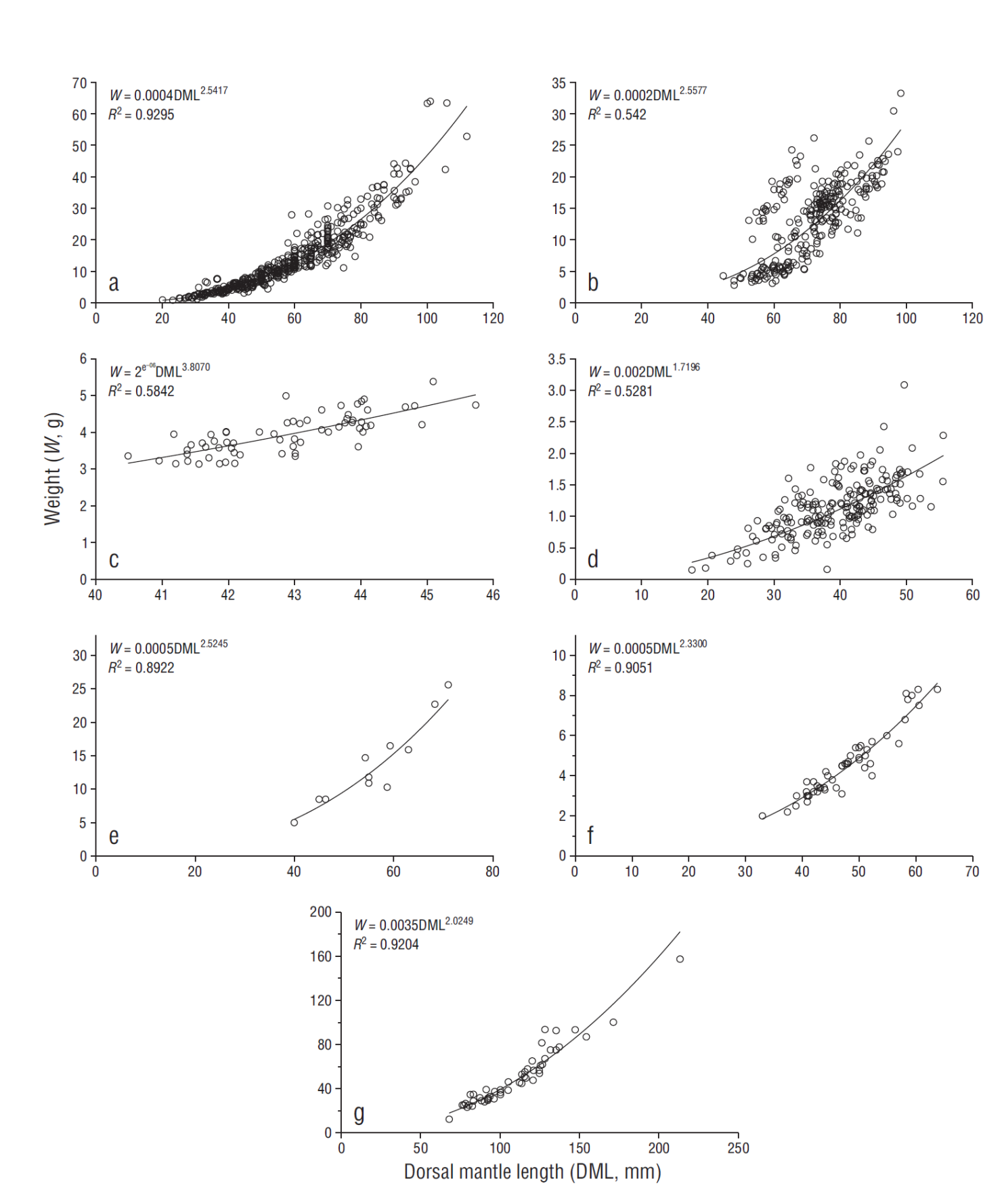 Figure 1 Length-weight relationship for the loliginid squids evaluated in this study. (a) Lolliguncula panamensis, (b) Lolliguncula diomedeae, (c) Lolliguncula argus, (d) Doryteuthis opalescens, (e) Lolliguncula brevis, (f) Doryteuthis plei, (g) Doryteuthis pealeii.