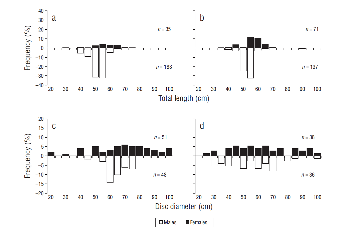 Figure 2 Sex-based size structure for the 4 most common elasmobranch species captured in commercial fisheries of the state of Sucre, Venezuela. Mustelus higmani (a), Mustelus canis (b), Hypanus guttatus (c), and Hypanus americanus (d).