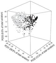 Figure 3 Principal coordinate analysis of the demersal fish assemblages recorded in the landings made in each season. The black squares correspond to landings for the dry season and the gray circles to landings for the rainy season.